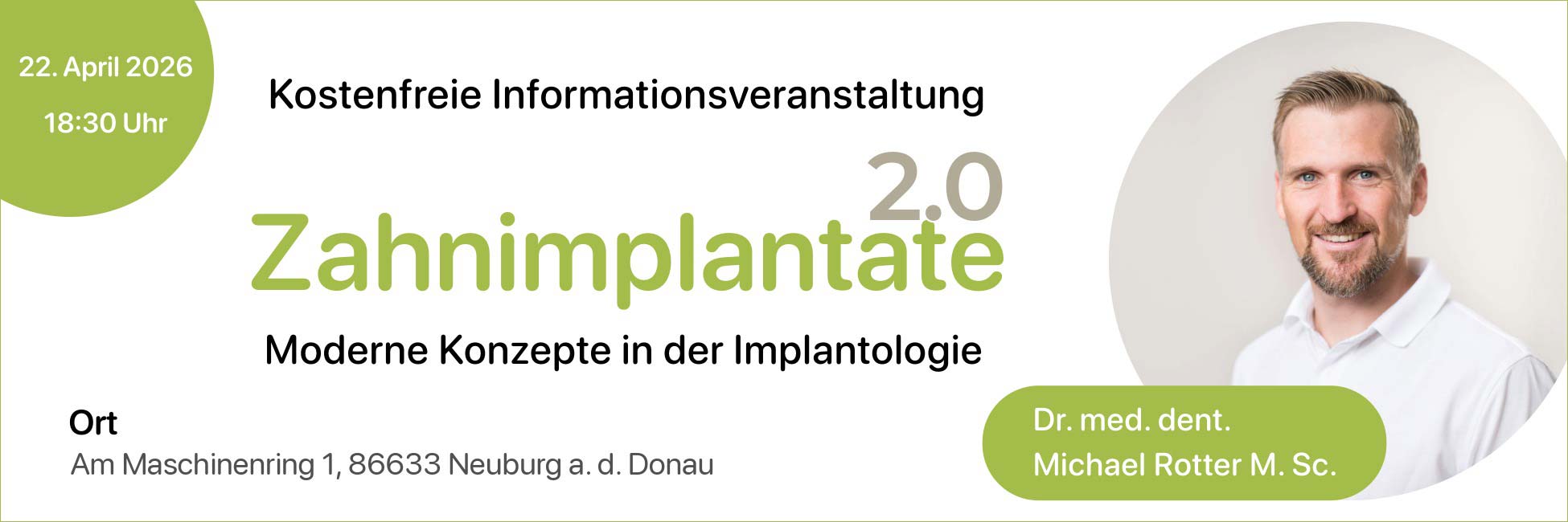 Fehlende Zähne können die Lebensqualität stark beeinträchtigen. Moderne Implantatlösungen bieten heute jedoch viele Möglichkeiten für festen und natürlich wirkenden Zahnersatz. In unserer kostenfreien Informationsveranstaltung erklärt Dr. Michael Rotter verständlich die verschiedenen Behandlungsmöglichkeiten und beantwortet Ihre persönlichen Fragen.